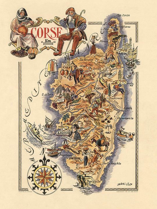 Historically significant elements are woven throughout the map, with illustrations of notable figures such as Napoleon Bonaparte, who was born in Ajaccio. The map also highlights local crafts and trades, such as fishing and farming, offering a glimpse into the traditional livelihoods of Corsicans. This blend of historical and cultural elements, combined with Liozu's artistic prowess, makes the "Corse" map a remarkable piece that celebrates the rich heritage and natural splendor of Corsica.