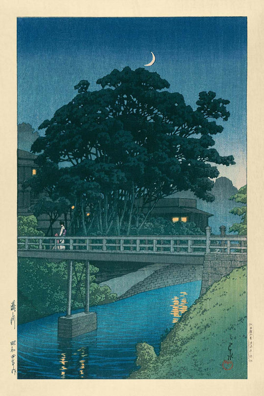 "Takinogawa Bridge" by Hasui Kawase is a stunning woodblock print from 1935 that beautifully encapsulates the serene and scenic landscape of Japan. Hasui Kawase, a revered artist in the realm of traditional Japanese woodblock prints, is celebrated for his meticulous attention to detail and ability to vividly capture the Japanese landscape. His work is often associated with the shin-hanga movement, which sought to imbue traditional ukiyo-e art with a sense of realism and modernity.
