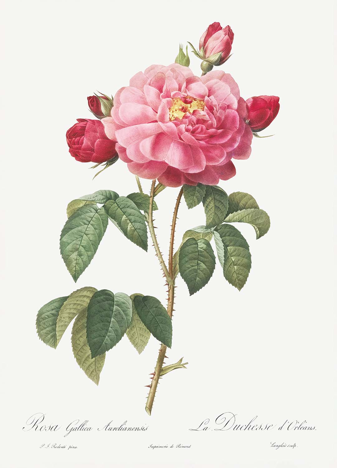 Gallic Rose Botanical Illustration by Pierre-Joseph Redouté, 1817