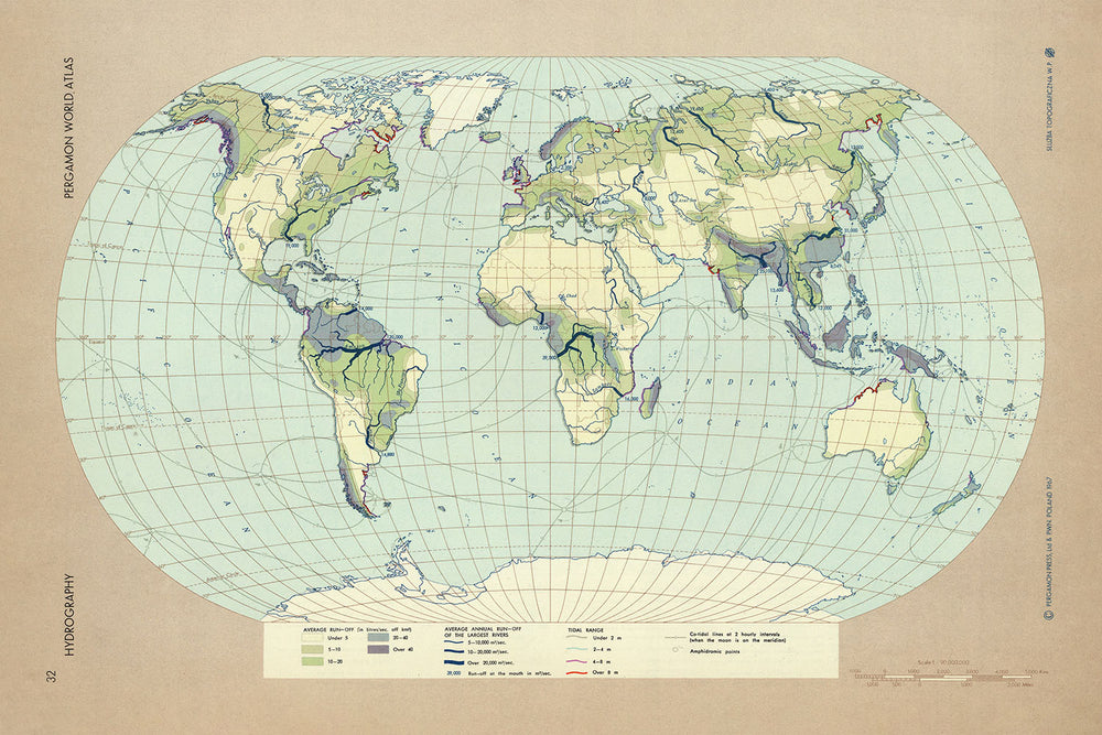 This 1967 World Hydrography map, published by the Polish Army Topography Service, is a fascinating and visually stunning infographic that presents a wealth of data about the world's water resources. The map's main focus is on hydrography, including runoff, rivers, and tidal range globally.