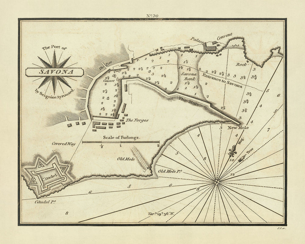 Beyond its navigational utility, the chart serves as a window into the past, offering insights into the urban and architectural development of Savona at the turn of the 19th century. Notable features such as the citadel, church, hospital, market, and customs house are all meticulously marked, providing a comprehensive view of the city's key components. This chart not only maps geographical locations but also delineates the cultural and economic landscape of Savona during a pivotal era in its history.