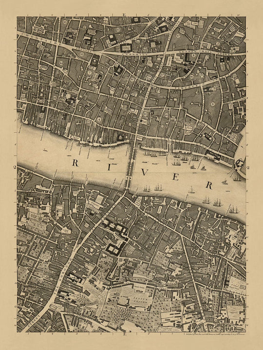 This map was originally published in 24 sheets. The map shown here is sheet E2, focusing on the stretch of Thames spanned by London Bridge, with Borough on the south side and City of London on the north side.