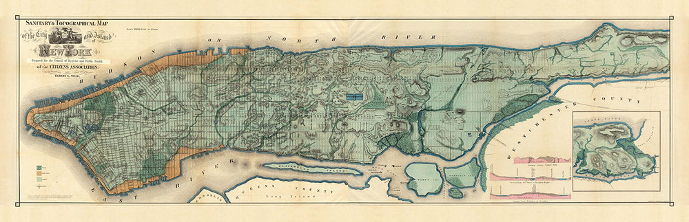 Old Map of Manhattan's Sewers and Waterways in 1865 by Ferdinand Mayer & Co: Hudson River, East River, Blackwells Island, NYC, Central Park