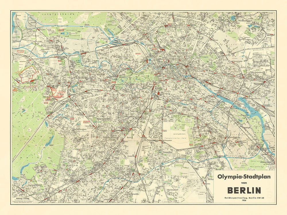Step into the heart of 1930s Berlin with the "Olympia-Stadtplan von Berlin," a masterfully detailed city map published in 1936 by the Reichssportsverlag. Created expressly for the historic 1936 Summer Olympics, this map offers a unique window into a city at the crossroads of history and spectacle. Its original German title, rich with Olympic promise, hints at the map’s purpose: to guide international visitors through the vibrant, sprawling metropolis as it hosted the Games of the XI Olympiad—an event that would become one of the most scrutinized and discussed in modern history.