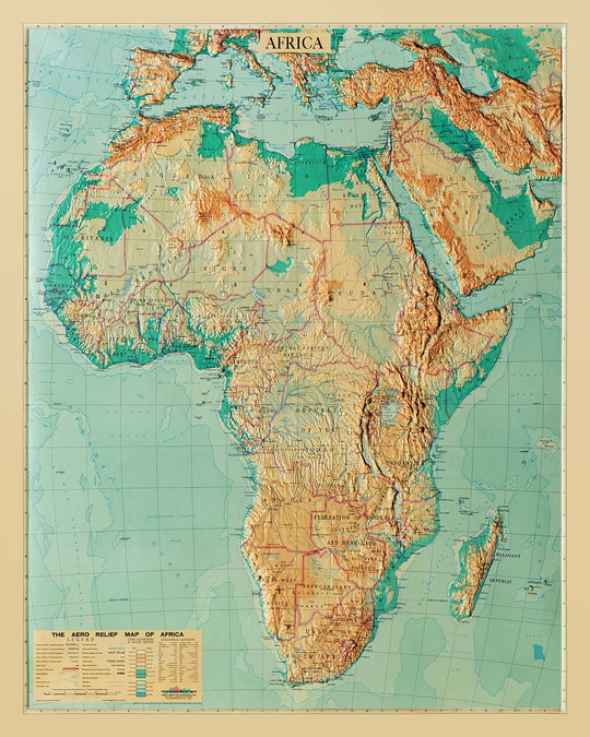 The "Aero Relief Map Of Africa" is a captivating piece of cartographic history, meticulously crafted by the renowned Aero Service Corporation in 1961. This map stands as a testament to the mid-20th-century advancements in cartography, offering a tactile and visual journey across the African continent. Its detailed 3D relief design allows viewers to experience the diverse landscapes of Africa, from the towering Atlas Mountains to the vast Sahara Desert, providing an immersive educational tool that transcends mere observation.