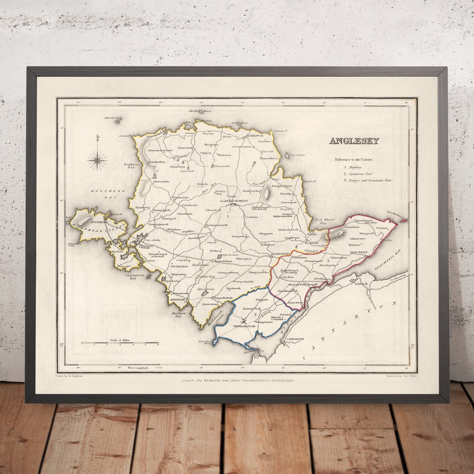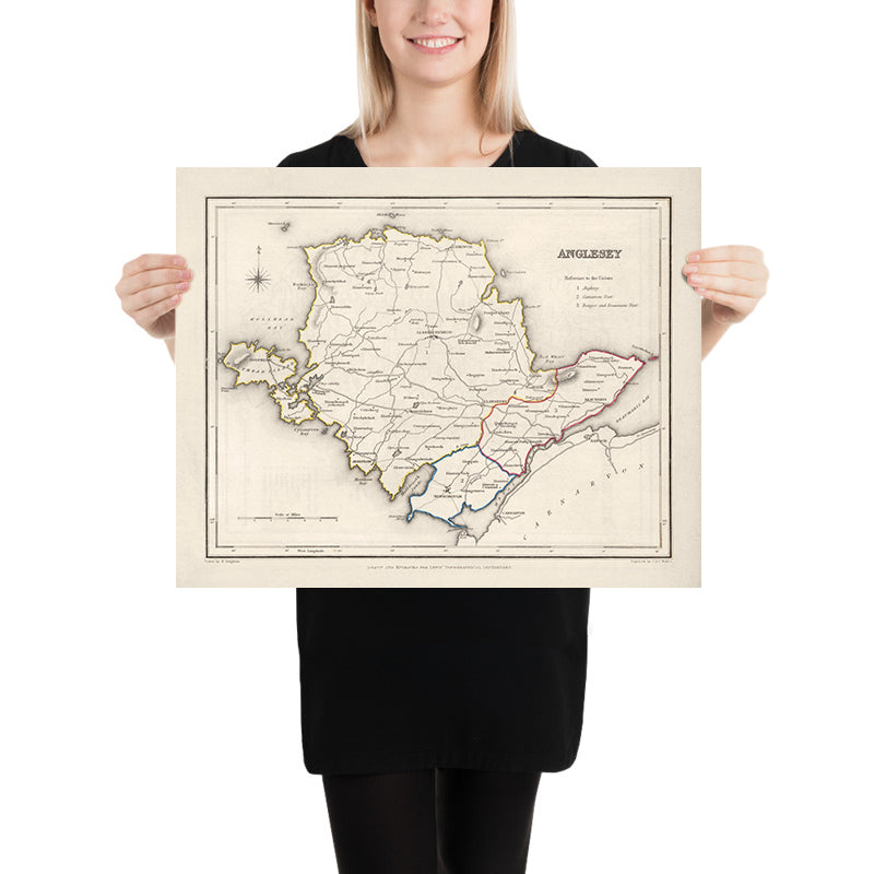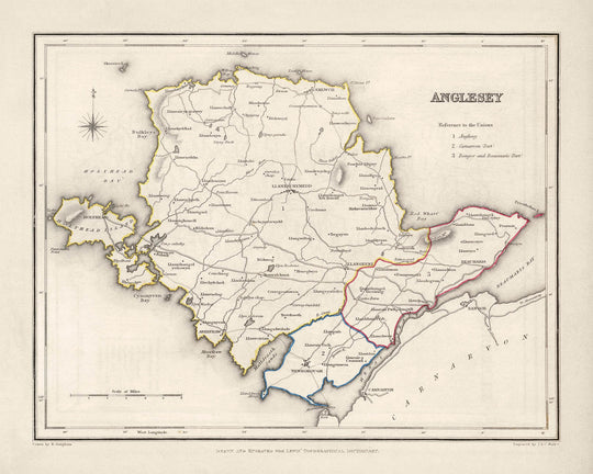 Anglesey is the crisply titled centerpiece of Samuel Lewis’s 1844 survey of Wales, issued by Samuel Lewis & Co. Conceived to accompany his celebrated topographical dictionaries, the map distills the island’s geography and civic order into an elegant, hand-colored composition. A fine compass rose tips the island askew, with north set to the upper left, while firm outline color differentiates administrative divisions and borough jurisdictions. Hachures impart a tactile sense of relief, letting low ridges and coastal escarpments read at a glance. Lewis records the arteries of movement—major roads, emerging railroads, bridges, and noted canals—alongside a careful lattice of rivers and streams. The result is a mid-19th‑century snapshot of Anglesey at the edge of transformative change, poised between maritime tradition and the momentum of industrial Britain.
