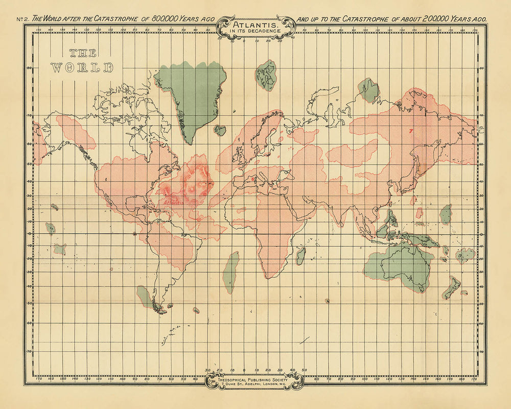 The map’s design reflects the early 20th-century fascination with mysticism and alternative spiritual histories. It showcases the imaginative reconstruction of Earth's geography following two catastrophic events believed to have occurred 800,000 and 200,000 years ago. Scott-Elliot's collaboration with Charles Webster Leadbeater, whose "astral clairvoyance" informed much of this work, is evident in the detailed depiction of the supposed shifts in landmasses. The map’s intricate grid lines and artistic embellishments highlight the blend of scientific inquiry and spiritual vision that characterized the Theosophical Society’s approach.