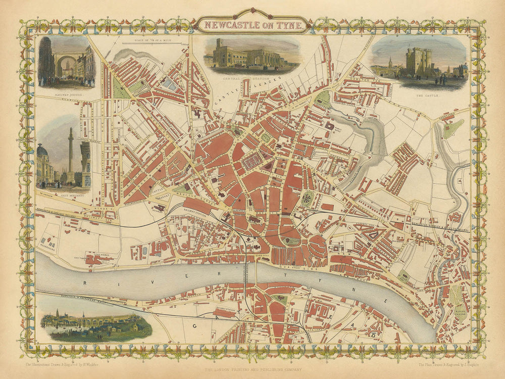 The map’s design is a testament to Tallis’s ability to blend cartographic precision with artistic elegance. His use of full-color representation and distinctive architectural details adds depth and narrative to the cityscape. The map is not just a navigational tool but a piece of art that invites viewers to explore Newcastle’s rich history and cultural heritage. It stands as a remarkable example of Tallis’s legacy, capturing the spirit of a city in transition.