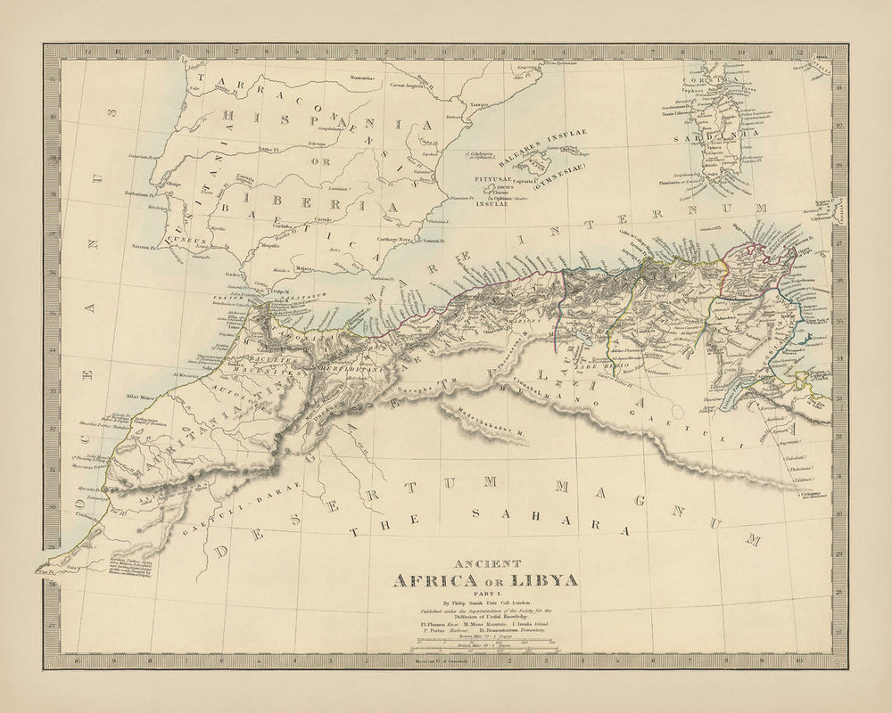 Ancient Africa or Libya Part I, crafted by the esteemed Society for the Diffusion of Useful Knowledge (SDUK) in 1845, offers a captivating glimpse into the geographical and historical tapestry of the Western Mediterranean region. This map, with its intricate detailing, captures the African coastline from Menix Island and Pons Zita, extending beyond the majestic Atlas Mountains to the Atlantic Coast. It reflects the 19th-century European fascination with Africa, a land of untapped potential and mystery, making it a significant artifact of colonial ambition and exploration.