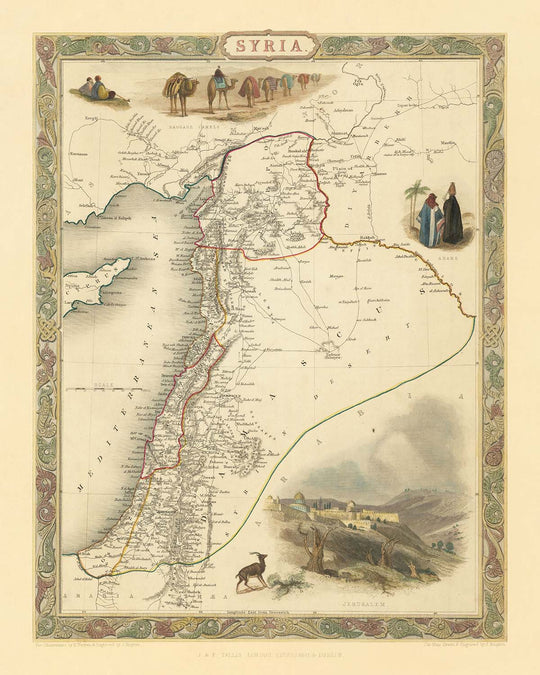 The map’s visual richness is further enhanced by Tallis’s signature decorative vignettes, which frame the cartographic detail with evocative scenes of Jerusalem, local inhabitants in traditional attire, and caravans of baggage camels traversing the arid landscape. These illustrations not only add aesthetic value but also serve as a cultural lens, offering insight into the daily rhythms and enduring traditions of the people who shaped the land. The physical geography is rendered with equal care, highlighting the imposing Lebanon and Anti-Lebanon mountain ranges, the shimmering Dead Sea, and the lush valleys that have sustained civilizations for millennia.