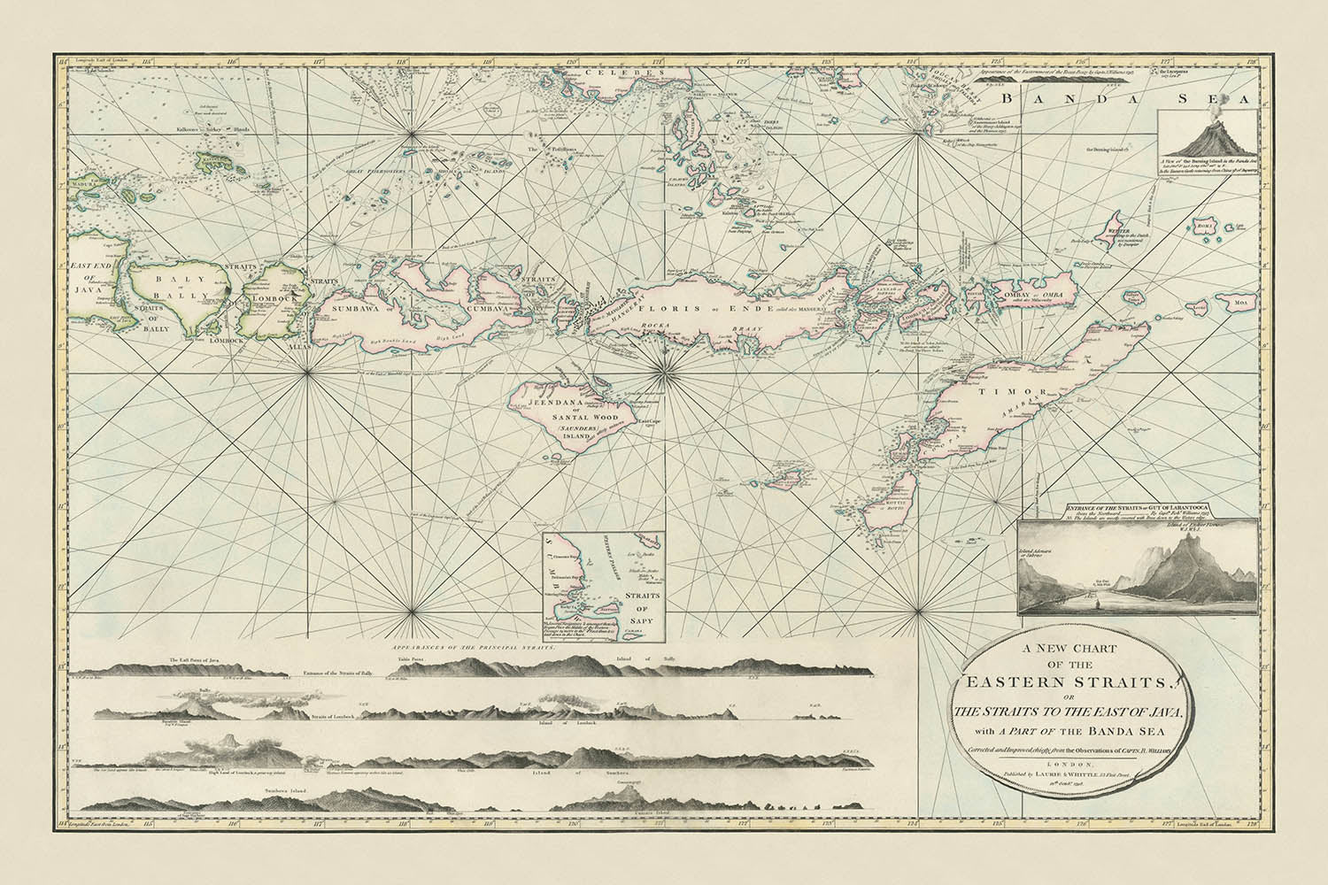 Laurie & Whittle's attention to detail is evident in the map's design, which includes inset views and coastal profiles that enrich the viewer's understanding of the region's topography. The depiction of the Straits of Larantooca and a volcanic island in the Banda Sea adds layers of intrigue, inviting the viewer to delve deeper into the geographical and geological features of the area. These elements, combined with the map's navigational aids like compass roses and soundings, make it an invaluable resource for understanding historical navigation techniques.