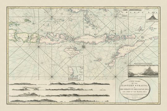 - Inset views: Depictions of the Straits of Larantooca and a volcanic island in the Banda Sea.