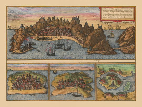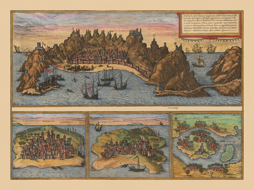 Old Pictorial Map of Aden by Braun & Hogenberg, 1572: Mombasa, Kilwa, Sofala, Fortifications, Harbors, Ships