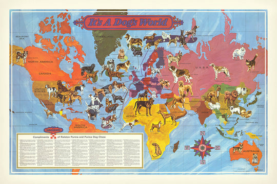 "It's A Dog's World" is a captivating thematic map created in 1968 by Langeneckert for the Ralston Purina Company. This unique map overlays the global distribution of canine breeds onto the geopolitical boundaries of the mid-20th century, offering a playful yet educational perspective on the world of dogs. As a promotional item for Purina Dog Chow, it reflects the era's cultural intersections between pet care industries and consumer culture, capturing the burgeoning interest in domestic pets and their role as companions and family symbols.