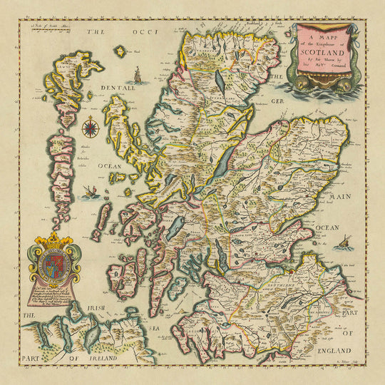 The map itself is a fascinating window into the political and physical landscape of 17th-century Scotland. Each historical county and region is clearly delineated, with borders crisply defined to reflect the intricate patchwork of Scottish governance. The Highlands, with their shaded relief, rise dramatically in the north and west, while the Lowlands are etched with rivers and fertile valleys. Major bodies of water such as the North Sea—here labeled as the German Ocean—the Irish Sea, and the iconic Firths of Forth and Clyde, frame the kingdom and hint at Scotland’s maritime heritage. Loch Lomond and Loch Ness, legendary for their natural beauty and folklore, are also prominently featured.