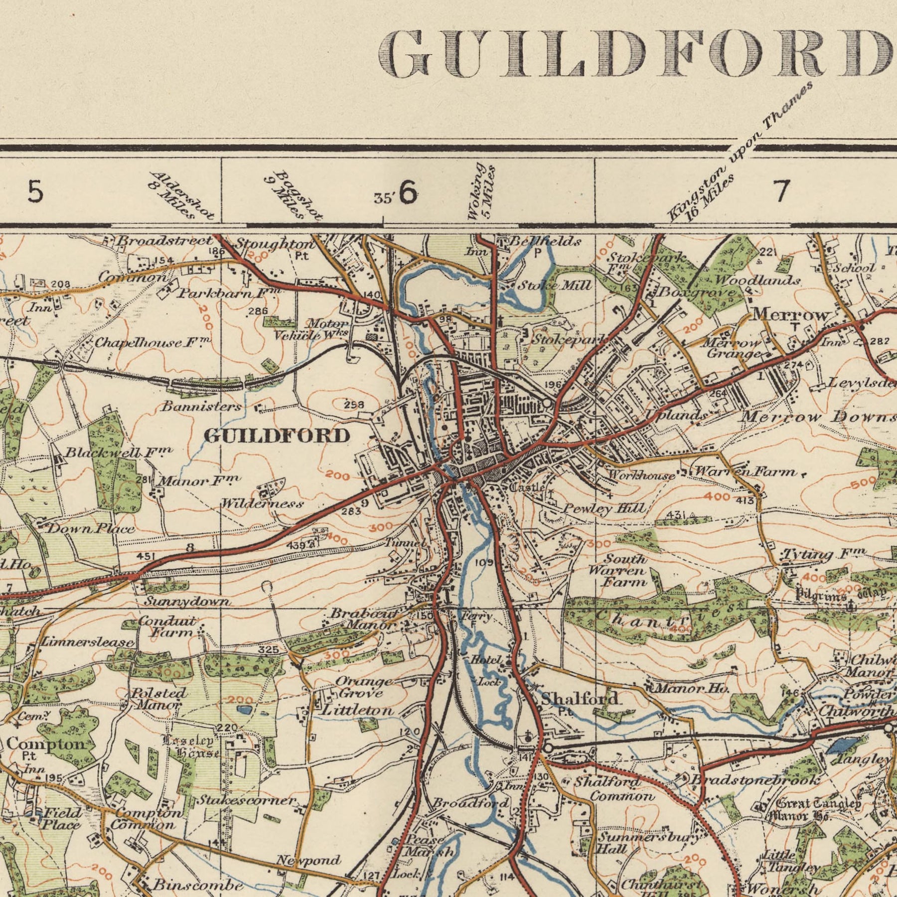 This vintage map, titled "Sheet 124 - Guildford & Horsham," is a part of the Ordnance Survey's One-inch "Popular" edition of England and Wales, published in 1925. The map showcases the towns of Guildford and Horsham, along with several other significant settlements and features. In addition to Guildford and Horsham, this map includes the towns of Aldershot, Farnham, Reigate, Godalming, and the Surrey Hills Area of Outstanding Natural Beauty (AONB).