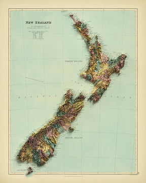The map showcases New Zealand's North and South Islands, highlighting the natural beauty and geographical features that define the country. The Southern Alps stretch majestically across the South Island, while the surrounding Pacific Ocean and Tasman Sea frame the nation's coastline. This map not only serves as a geographical guide but also as a historical snapshot of New Zealand's landscape in the late 19th century.