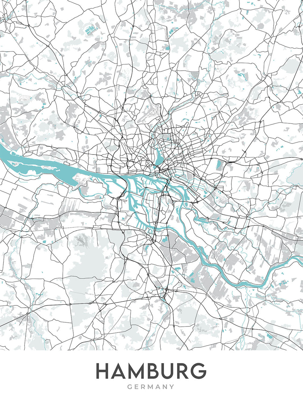 This map of Hamburg, Germany, is a modern, detailed street map without labels. It focuses on the city center and the surrounding neighborhoods, providing an up-to-date and visually appealing overview of this vibrant city. The map covers a wide range of neighborhoods, including the historic Altstadt, the trendy Neustadt, the lively St. Pauli, the multicultural Sternschanze, the charming Altona, the family-friendly Eimsbüttel, the affluent Rotherbaum, the elegant Harvestehude, the peaceful Eppendorf, and the beautiful Winterhude.