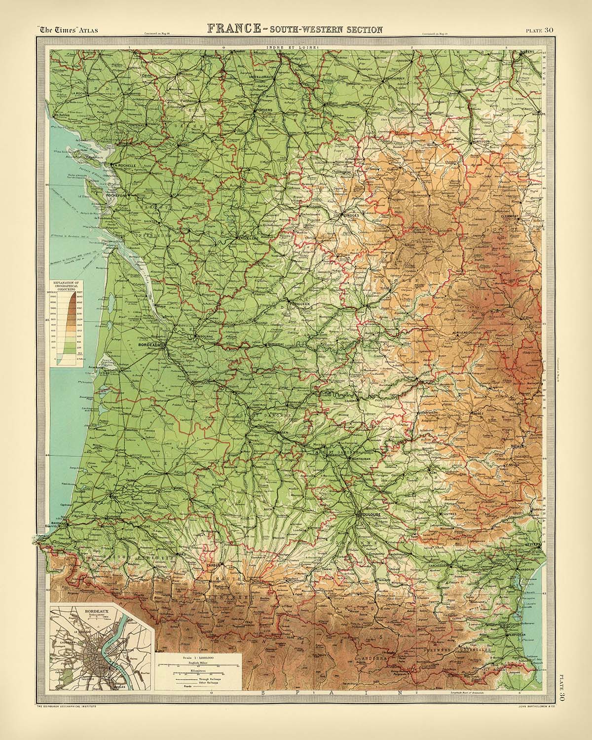 France - South-Western Section; Bordeaux, issued in 1922 for The Times atlas by J.G. (John George) Bartholomew and the Edinburgh Geographical Institute, presents a masterfully balanced portrait of a region where river, coast, and upland converge. Centered on Bordeaux and sweeping across Gascony to the Pyrenees and the Bay of Biscay, the map fuses visual elegance with working intelligence. Hypsometric tints articulate relief in lucid gradations, while bathymetric coloring deepens seaward to disclose the continental shelf and nearshore banks. A rigorous symbology organizes roads, waterways, and settlements into a legible hierarchy, and designated shipping routes—complete with mileage—speak to the period’s practical navigational needs. It is a view of southwestern France at a moment of renewal and modernity, rendered with scientific clarity and quiet authority.