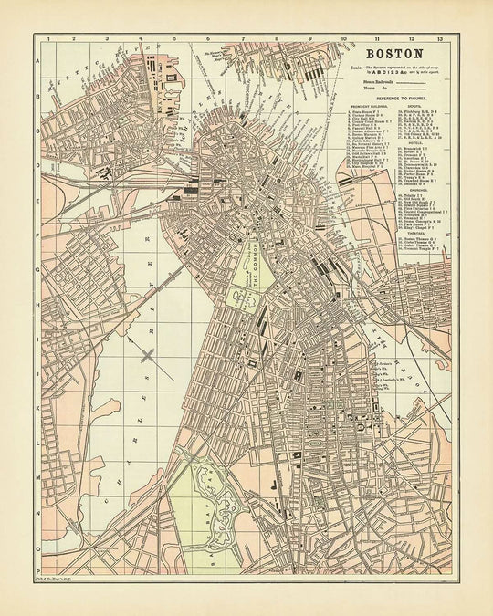 In addition to its urban features, the map highlights Boston's natural beauty, with the Charles River and The Fens elegantly depicted. These waterways and green spaces provided essential resources and recreational opportunities for the city's inhabitants. The map's attention to these natural elements reflects the harmonious balance between urban development and environmental preservation that Boston has long strived to maintain.