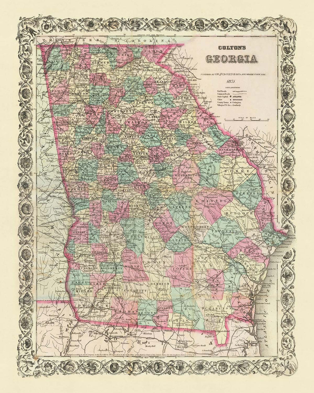 Immerse yourself in the fascinating history of the United States with this exquisite old map of Georgia, crafted by J.H. Colton in 1871. Colton, widely recognized as the preeminent American mapmaker of his time, has beautifully captured the essence of Georgia in the early years of the nation's history. This map serves as a testament to the dynamic nature of human civilization, reflecting the growth and evolution of the region over the last 150 years.