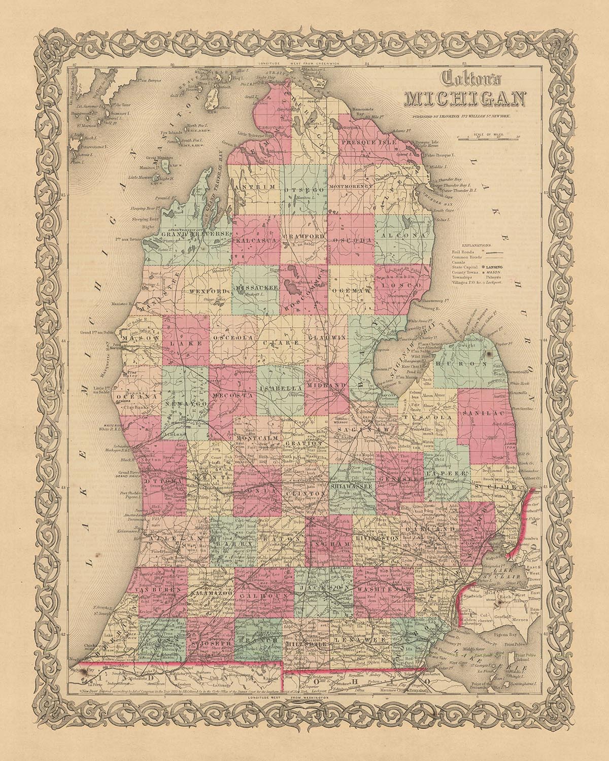 In conclusion, this 1855 map of Michigan by J.H. Colton is a historical artifact of immense value. It provides a snapshot of a time when the United States was still young, and its future was being written. It is a testament to the skill and artistry of its creator and a window into the past that continues to shape the present. This map is more than just a representation of geographical information; it's a piece of history that tells a story of a time and place that has long since evolved.