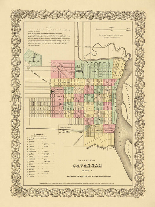 J.H. Colton, a renowned 19th-century American map publisher, was known for his high-quality and detailed cartographic works. His maps were celebrated for their accuracy and aesthetic appeal, making them prized possessions for collectors and historians alike. This map of Savannah exemplifies Colton's dedication to precision and beauty, with its colorful design and decorative border adding to its allure. The inclusion of a reference key naming 24 places of interest further enhances its value as a historical artifact.