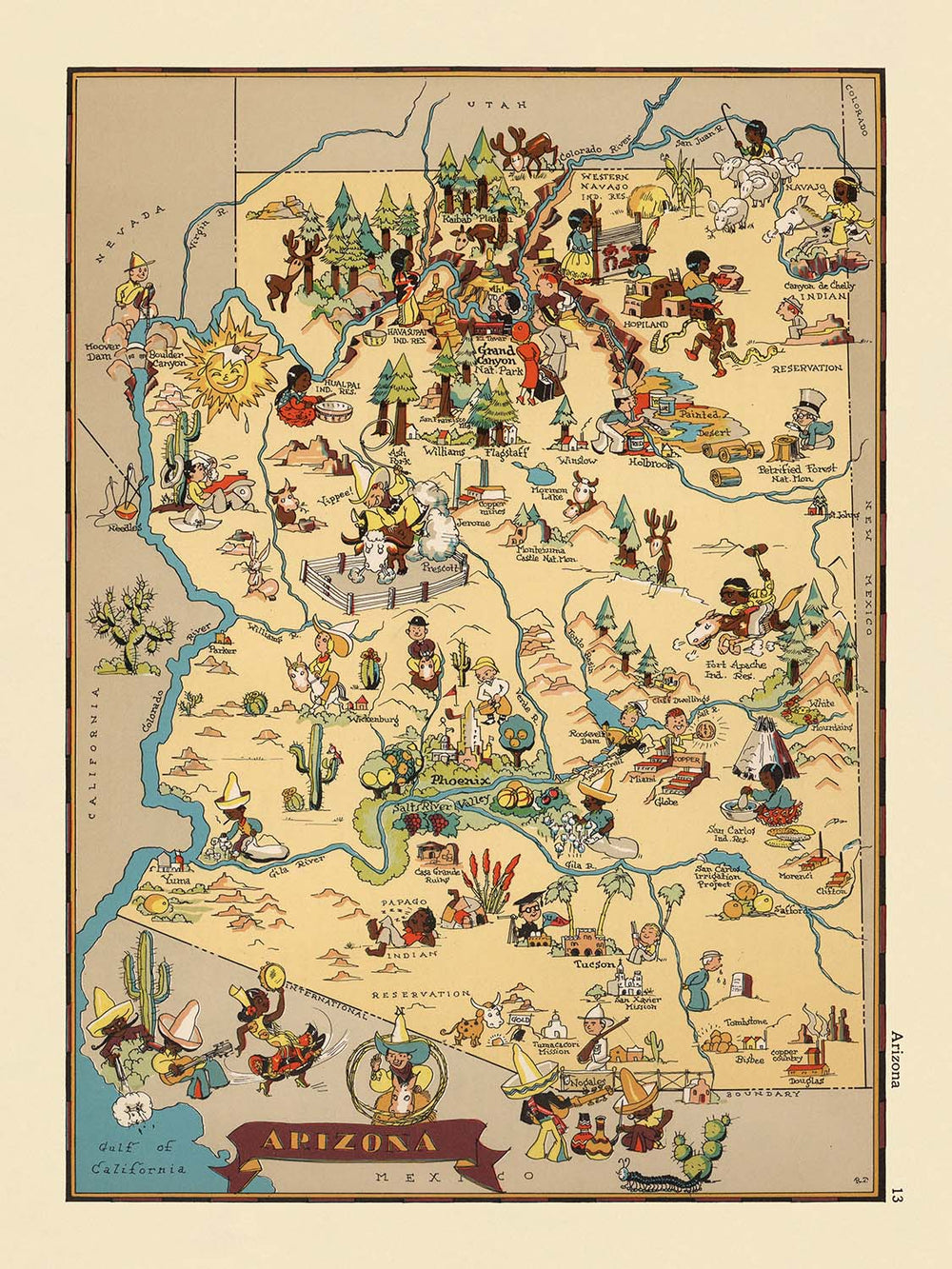 - Cultural and social context: Illustrations reflect the unique identity and history of Arizona, including depictions of Native American culture, mining, ranching, and desert life.