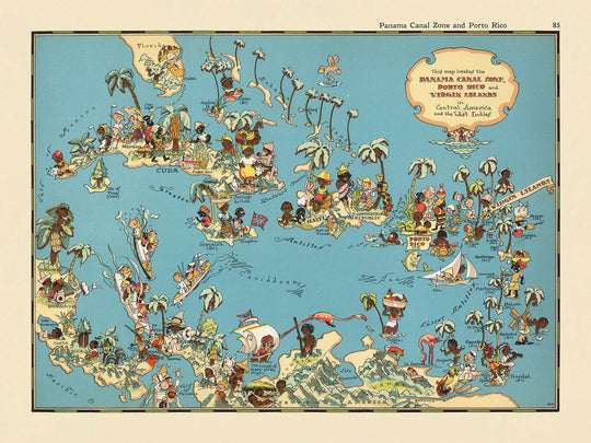 Historically, this map is a fascinating artifact, capturing a moment when the Panama Canal was at the zenith of its geopolitical importance and when American interest in the Caribbean was both strategic and cultural. The playful, cartoon-like style belies a deeper narrative of exploration, commerce, and cross-cultural exchange. As both a work of art and a document of its time, “Panama Canal Zone, and Puerto Rico” offers collectors and enthusiasts a rare glimpse into the world as it was seen—and imagined—nearly a century ago, making it a truly exceptional addition to any collection of historical maps.