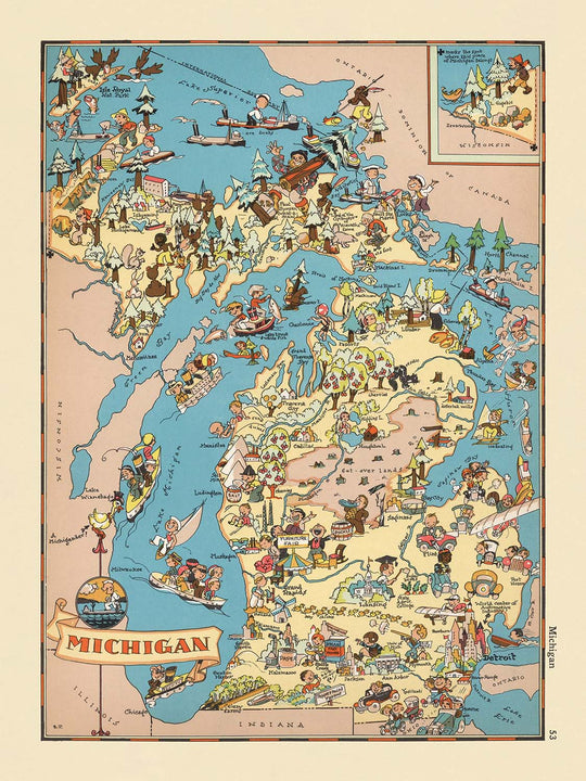Step into the vibrant world of 1930s America with "Michigan," a captivating pictorial map originally crafted by Ruth Taylor White in 1935. This map, drawn at the height of the Great Depression, is a visual celebration of Michigan’s spirit, rendered in a whimsical and colorful style that both entertains and informs. Its original title, simply "Michigan," reflects the artist’s focus on capturing the unique character and culture of the state as it stood nearly a century ago. With each brushstroke, White invites viewers to experience the richness of Michigan’s landscapes and the bustling life of its communities, making this map a delightful historical artifact for collectors and enthusiasts alike.