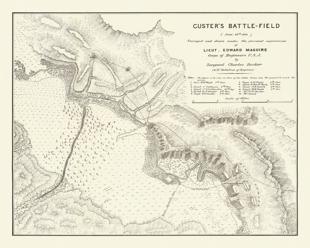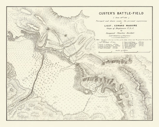 Custer's Battle-Field (June 25th, 1876), created by the U.S. Army Corps of Engineers through the direct supervision of Lieutenant Edward Maguire, stands as one of the most authoritative historical maps capturing the moments of the Battle of the Little Bighorn, also infamously known as Custer's Last Stand. Produced in 1876 shortly after the fateful clash, this copperplate engraving provides extraordinary detail about the site of Lt. Col. George Armstrong Custer’s defeat near the mouth of the Bighorn River in southeastern Montana. The map was meticulously surveyed as Maguire accompanied rescue forces to the battlefield, creating a cartographic document that serves not just as a navigational tool but as a testimonial to a pivotal event in the American West.