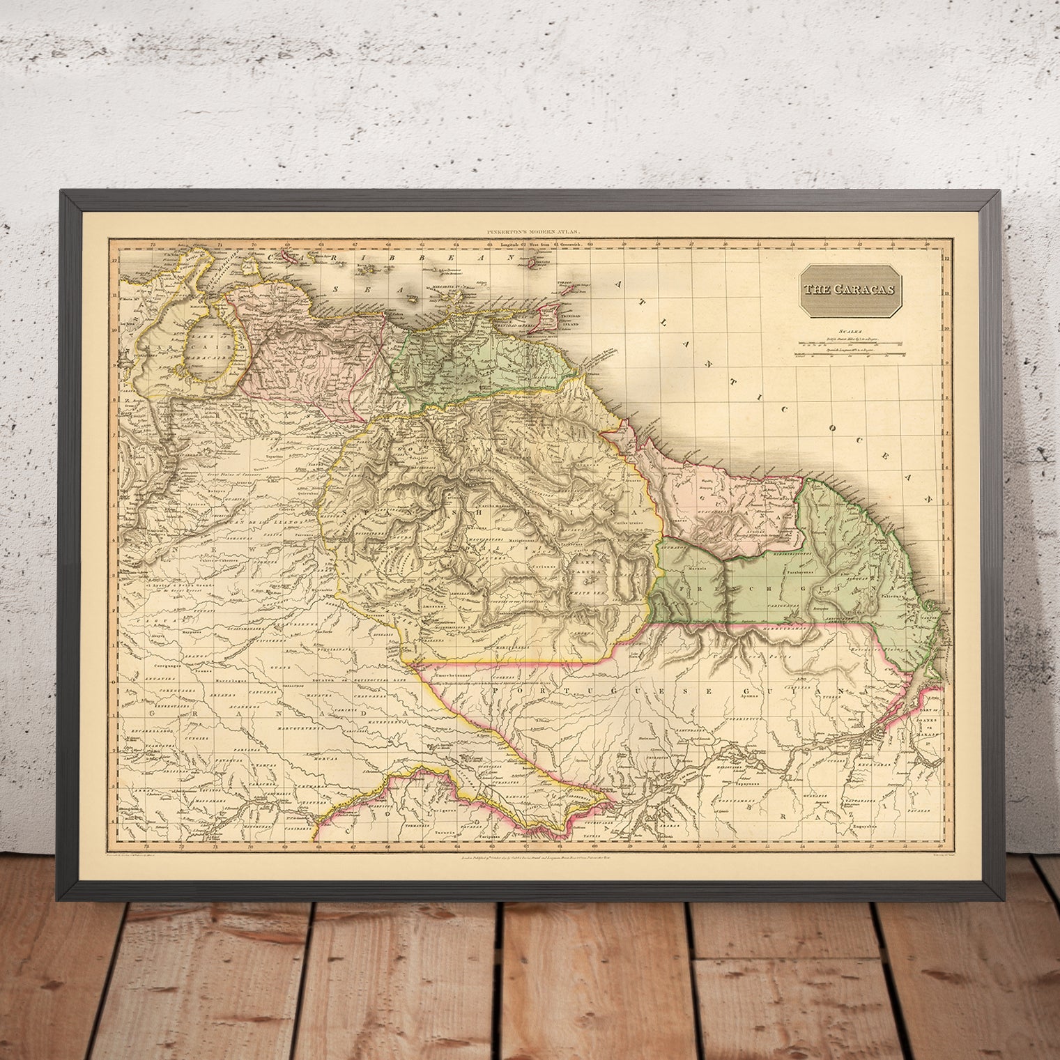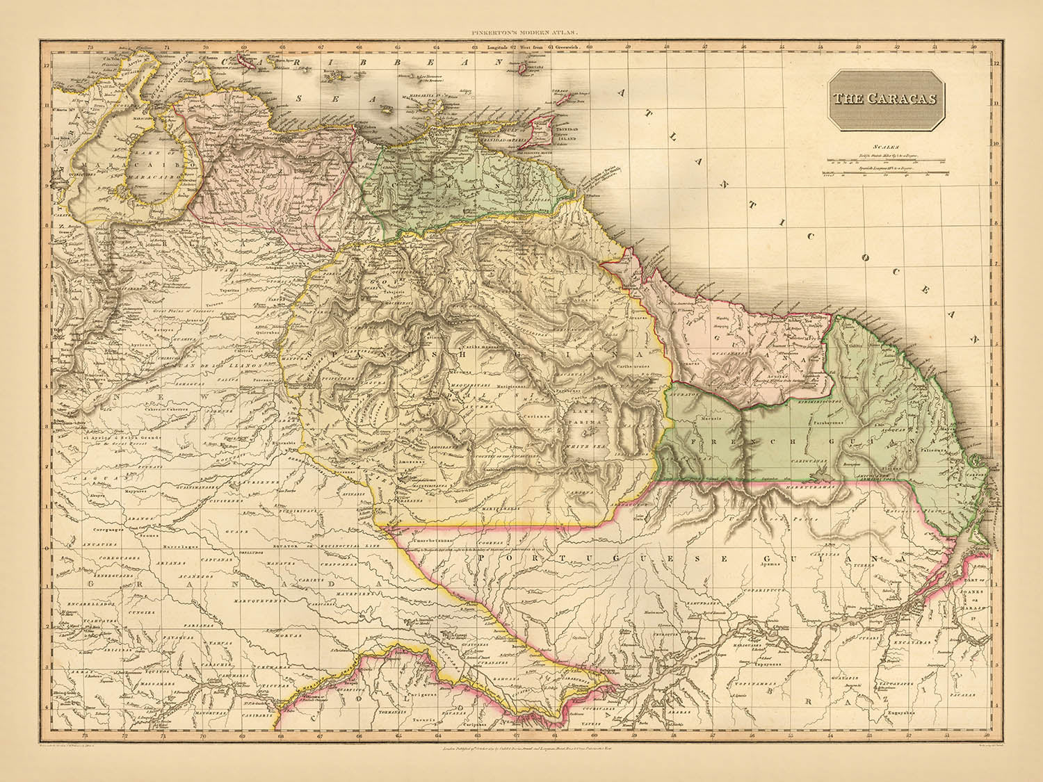 Cities and routes are inscribed with the certainty of Pinkerton’s hand. Caracas anchors Venezuela’s interior network; Maracaibo guards the western littoral; Valencia and Barquisimeto mark the corridors that knit uplands to coast. In Colombia, Bogotá’s plateau authority contrasts with Medellín’s basin and Cali’s passage toward the Pacific, while Manaus rises where dark waters meet, a gateway to the upper Amazon. The color-coded borders provide an immediate political reading, while the latitudinal and longitudinal indicators affirm the map’s scientific intent. As a whole, this composition distills early nineteenth-century understanding into a lucid, beautiful synthesis—an enduring reference for historians and a connoisseur’s piece for those who prize the union of art and intelligence.