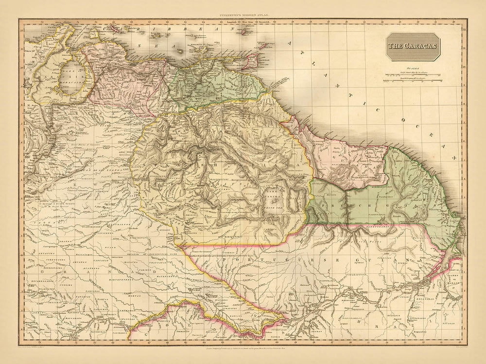 The Caracas, issued by John Pinkerton in 1815, is a landmark statement of South America at the very moment Venezuela first emerged on the world stage. Among the earliest maps to register an independent Venezuela, it frames the upheaval of the revolutionary era within a finely observed geography that stretches across Venezuela and Colombia and deep into Brazil, following the Amazon and its tributaries far into the interior. Recognized in its day as one of the finest regional treatments to appear in an English atlas, it pairs political insight with scientific restraint. Borders are cleanly differentiated, terrain is richly articulated, and major waterways are traced with an authority that still feels fresh, all while an elegant cartouche confers a sense of classical dignity.