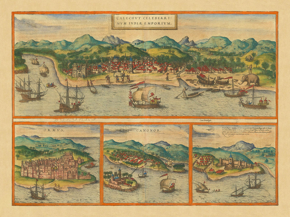 Old Map of Calicut in India by Braun & Hogenberg, 1572: Ormuz, Canonor, El Mina, Ships