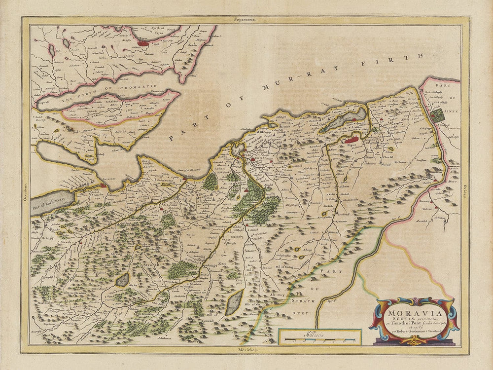 This rare, colour map of Inverness, Highlands and Moray (or Moravia in Latin) in 1654 comes from the first ever atlas of Scotland, Jean Blaeu's Theatrum Orbis Terrarum (Latin for the Theatre of the Orb of the World). It was hand coloured and printed on vellum. The cartographer for this map was Timothy Pont.