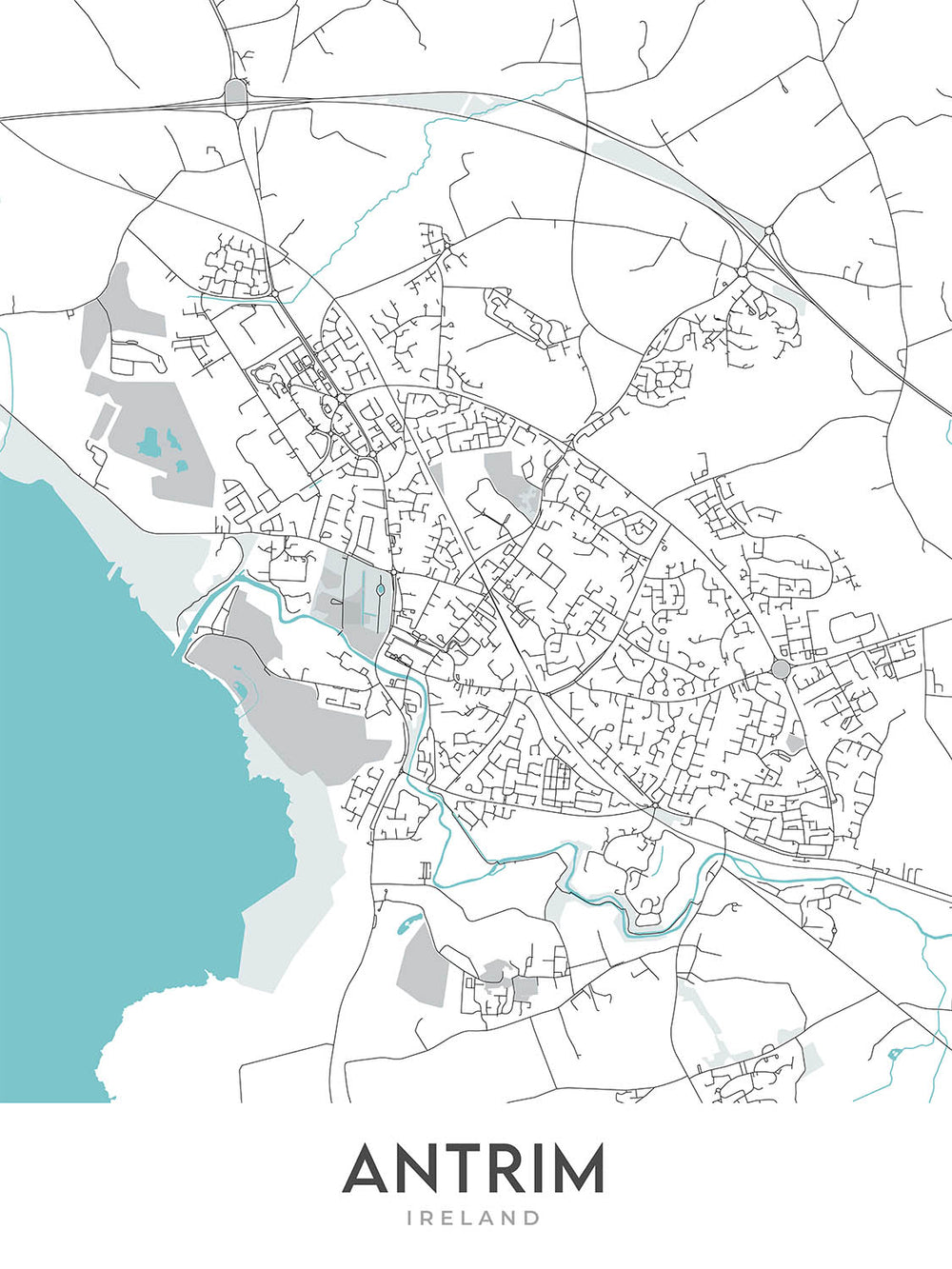 For those who appreciate the finer aspects of home furnishings, this map offers a perfect blend of elegance and sophistication. Its modern design and meticulous attention to detail make it an ideal addition to any art collection. The map's portrayal of Antrim's vibrant neighborhoods and significant landmarks, such as the Antrim Round Tower and Lough Neagh, creates a sense of connection to the city's rich cultural tapestry. It serves as a reminder of Antrim's unique charm and the beauty of its urban landscape, encapsulated in a piece of art that is both timeless and contemporary.