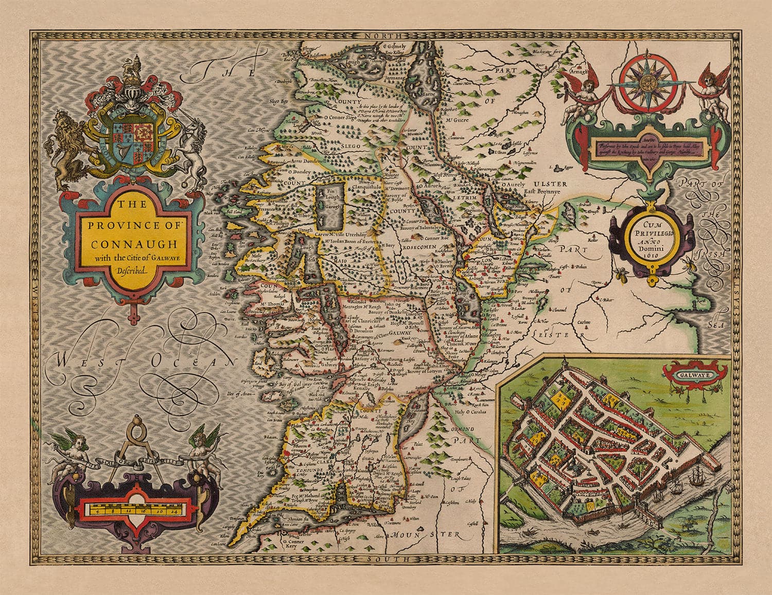 This old, full colour and exceedingly rare map shows the Irish province of Connacht (formerly called Connaught) in 1611. It was created by John Speed and engraved by Jodocus Hondius, and originally published in Speed's "The Theatre of the Empire of Great Britaine".