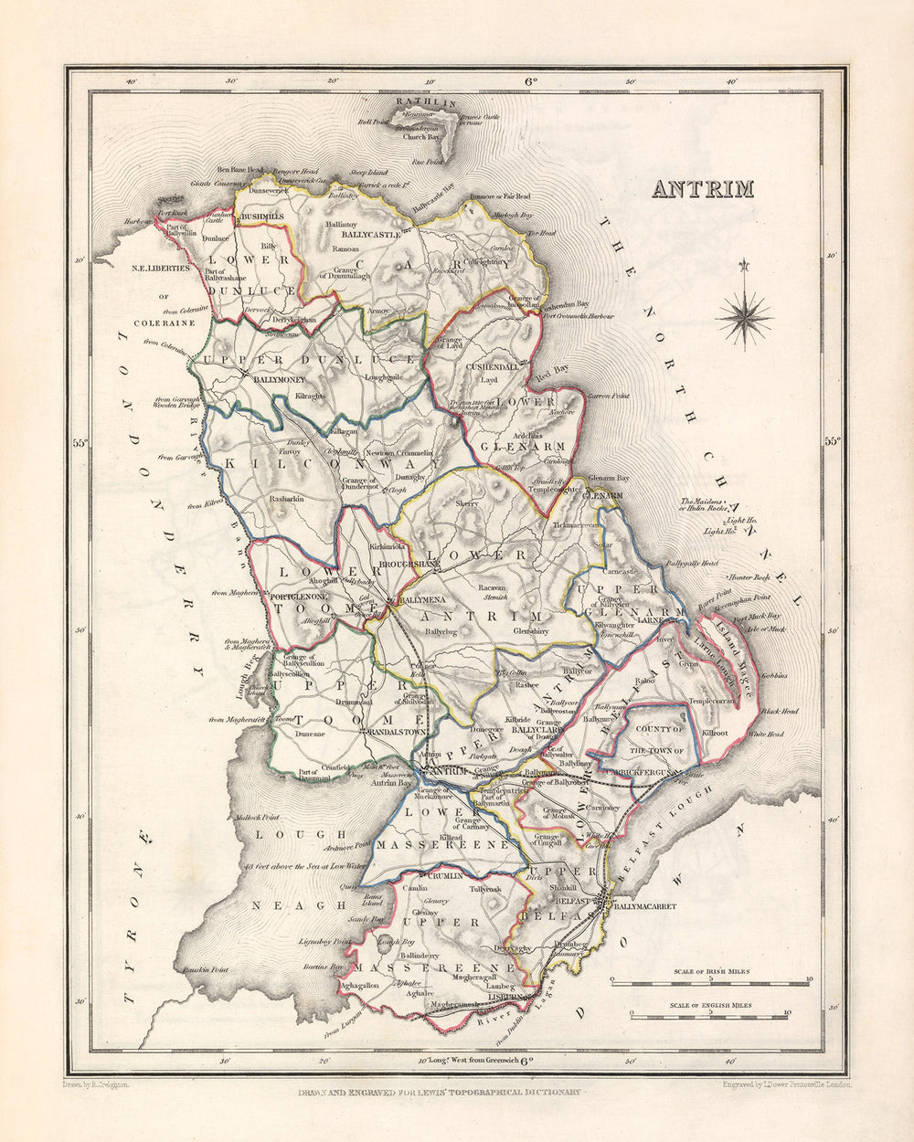 Old Map of County Antrim by Samuel Lewis, 1844: Belfast, Lisburn, Carrickfergus, Ballymena, Giant's Causeway