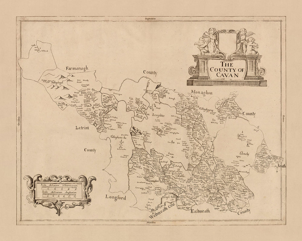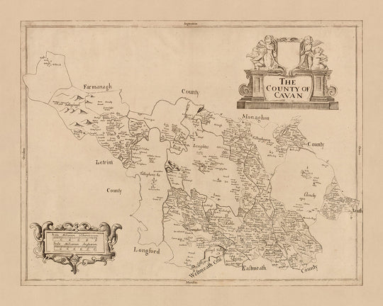 This map of County Cavan, published in 1685 by Sir William Petty, is a detailed political and physical map that provides a wealth of information about the county during the late 17th century. The map is based on the Down Survey of Ireland, the first detailed land survey on a national scale anywhere in the world, which was conducted from 1656 to 1658. Petty's map is a reduced scale version of the original Down Survey, but it still manages to capture an impressive amount of detail.