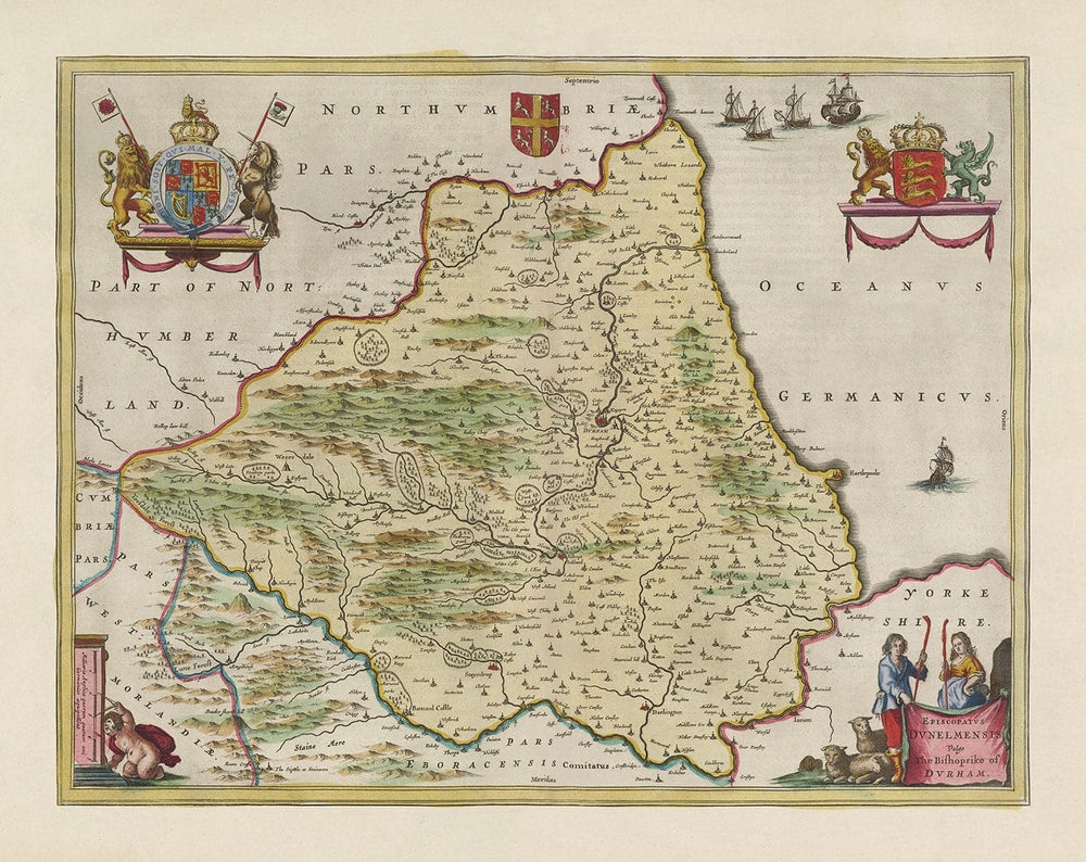 Old Map of County Durham, 1665 by Joan Blaeu: Darlington, Stockton-on-Tees, Sunderland, Hartlepool, Newcastle, Gateshead