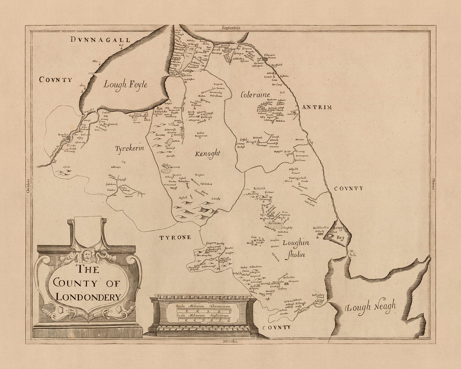 This map, titled 'County Londonderry', is a detailed political and physical map of County Londonderry, originally published in 1685 by Sir William Petty. It is a later, reduced scale map based on the Down Survey of Ireland, originally undertaken in 1656 to 1658. The Down Survey was the first ever detailed land survey on a national scale anywhere in the world. Its purpose was to measure lands which, following the calamitous English Civil War, much of which was fought on Irish soil, were to be taken from Irish Catholic landowners and given to English Protestants.