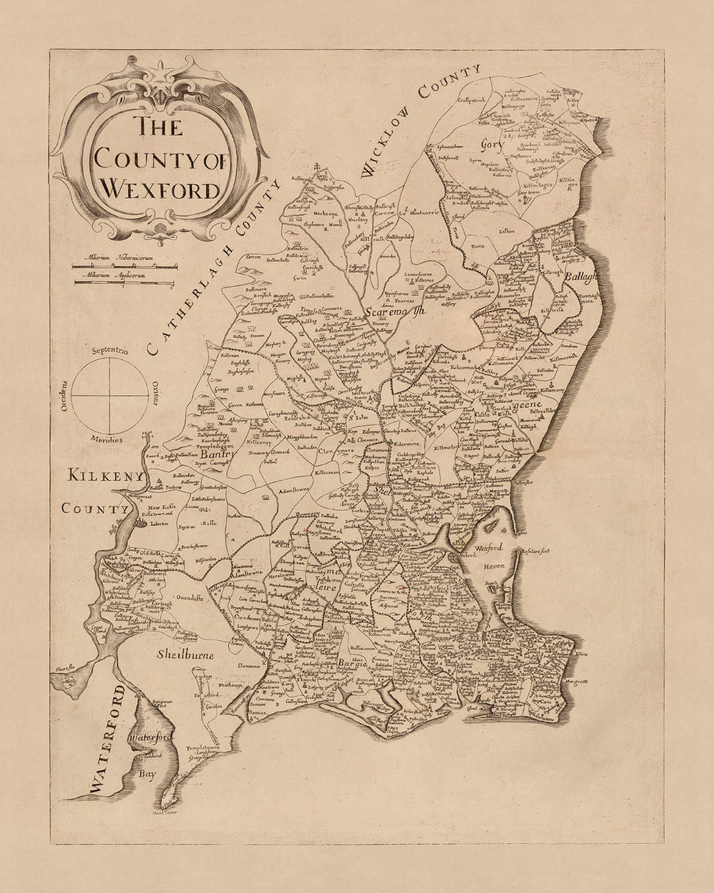 Old Map of County Wexford by Petty, 1685: Clonmines, Enniscorthy, New Ross, Bannow, Duncormick