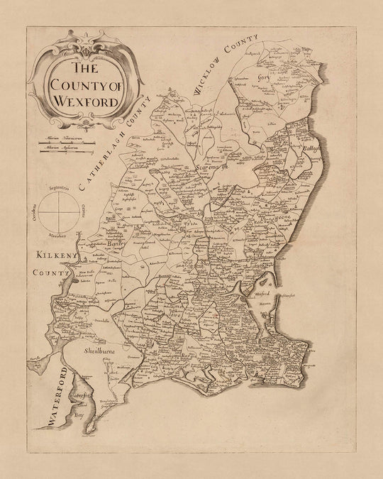 This map of County Wexford, published in 1685 by Sir William Petty, is a detailed political and physical map that provides a wealth of information about the county in the late 17th century. The map is based on the Down Survey of Ireland, the first ever detailed land survey on a national scale anywhere in the world. Petty's map shows roads, bridges, cities, places, bishopricks and archbishopricks that were present in the late 17th century in Ireland. Hills, forests, rivers, lakes and loughs are shown pictorially.