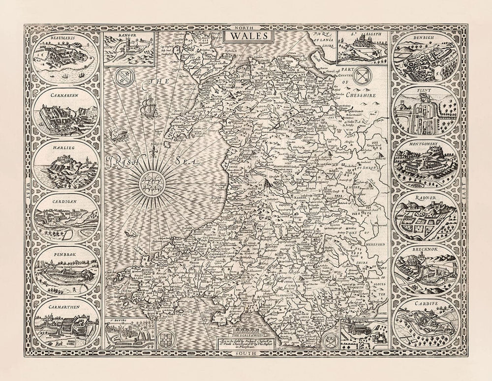 Around the edges of the map there are beautiful embellishments, including 16 views of what various Welsh towns looked like back in the 1600s.