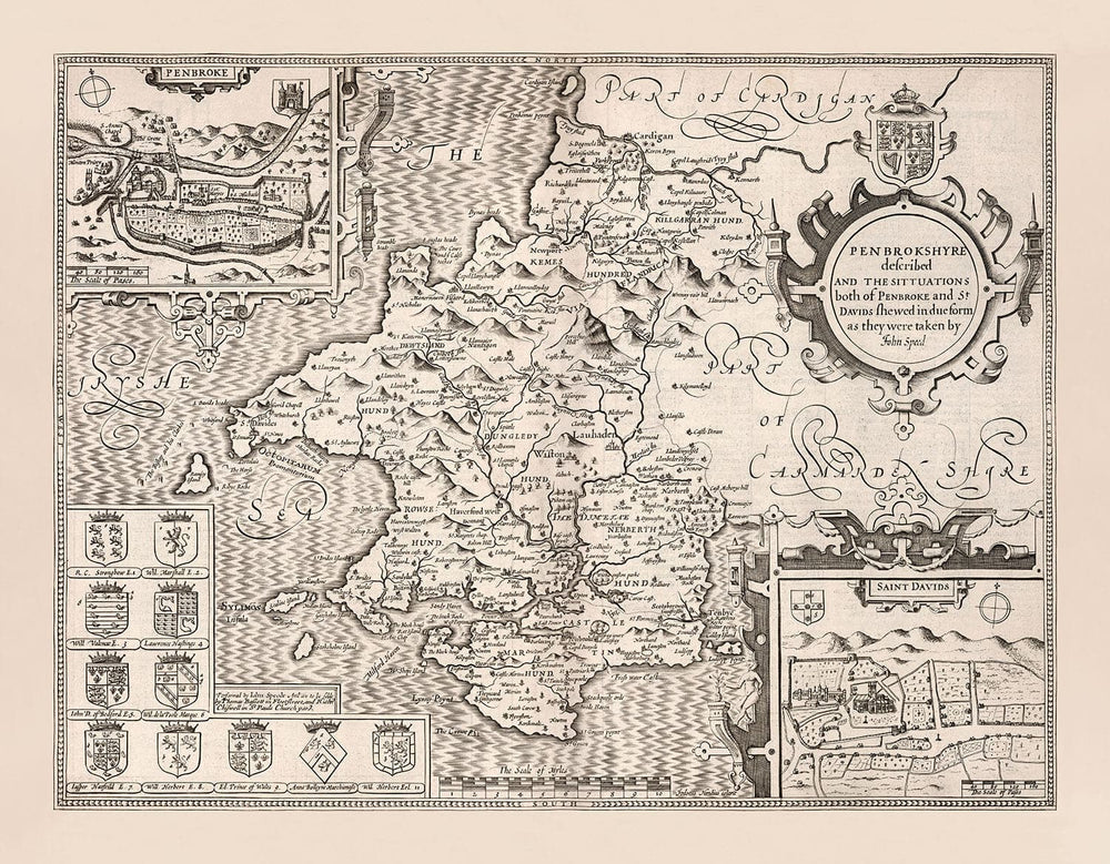 Many of the towns, villages and cities in Pembrokeshire are already visible in this map. Notably there's no Milford Haven though - Milford wasn't founded until 1793!