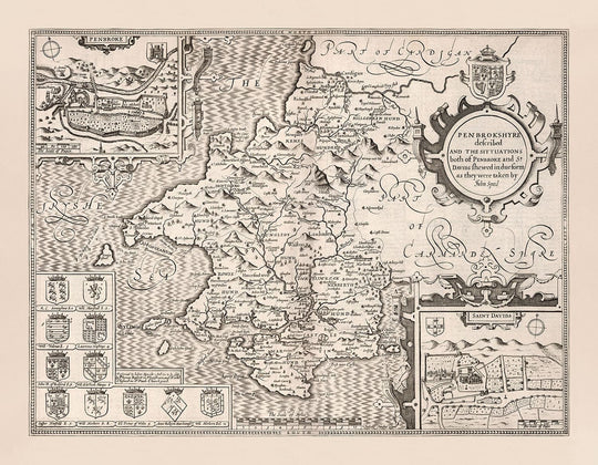 Old Monochrome Map of Pembrokeshire, Wales 1611 John Speed: Haverfordwest, St Davids, Fishguard, Southwest