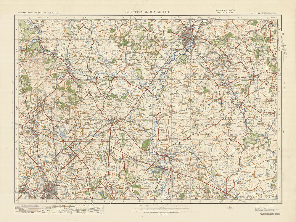 This Old Ordnance Survey Map, Sheet 62 - Burton & Walsall, 1925, offers a fascinating glimpse into the past, showcasing the towns, cities, and interesting features of the Burton & Walsall region in England. With its detailed cartography and historical significance, this map is a valuable resource for history enthusiasts, cartographers, and anyone interested in exploring the rich heritage of this area.