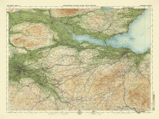Sheet 8 - Edinburgh District, created by the esteemed cartographer J.G. Bartholomew in 1901, is a testament to the art and science of early 20th-century mapmaking. Known as "the Prince of Cartography," Bartholomew's work is celebrated for its precision, beauty, and innovative use of color to depict landscape relief. This map, part of Bartholomew's flagship half-inch to the mile series, was designed to cater to cyclists and tourists, offering a detailed and visually appealing representation of the Edinburgh District. The map's meticulous gradation of color bands to indicate different land heights showcases Bartholomew's dedication to clarity and accuracy.