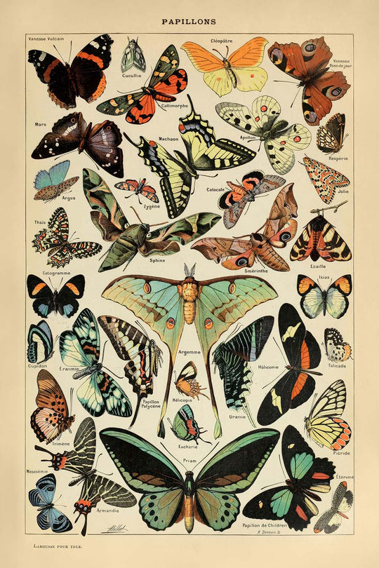 Butterflies by Adolphe Millot transports viewers into the vibrant, natural world of the late Victorian era. Created by the renowned French artist, lithographer, and entomologist Adolphe Philippe Millot in 1890, this enchanting zoological illustration was originally published for the esteemed French encyclopedia, "Le Larousse pour tous: nouveau dictionnaire encyclopédique." It features zoologically detailed renderings of a variety of butterfly species, each meticulously labelled in French, showcasing Millot’s unique confluence of scientific accuracy and artistic delicacy.