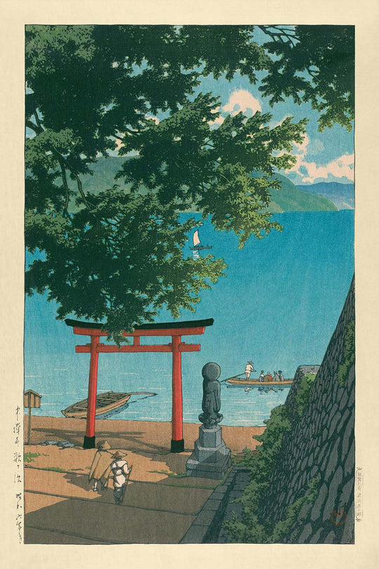 The artwork "Chuzenji Temple and Beach at Utagahama" by Hasui Kawase invites viewers into a serene and idyllic world crafted by masterful manipulation of woodblock printing. Created in 1935, this piece exemplifies Hasui Kawase's dedication to capturing the essence of Japan's landscape through the Shin-hanga movement, blending traditional ukiyo-e techniques with Western painting styles. Known for his ethereal depictions of nature, Kawase transports us to the shores of Lake Chuzenji, where the temple and beach meet in harmonious beauty.